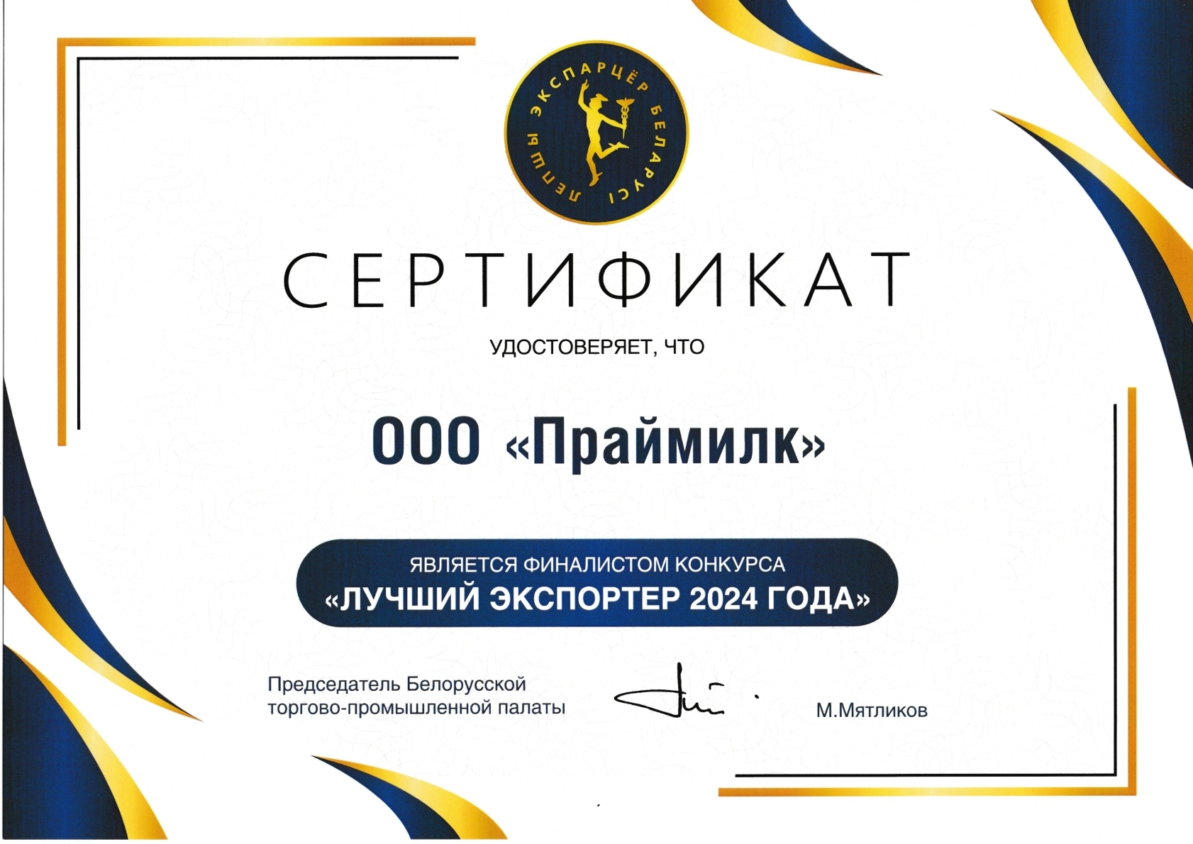 «Продэкспо — 2020» Мин-во сельского хозяйства РФ Россельхознадзор Диплом Лауреата международного конкурса «Лучший Продукт — 2020» награждается серебряной медалью ООО «Праймилк», РБ за концентрат молочно-жировой сухой КМЖ-С с массовой долей жира 50%, концентрат сывороточно-жировой сухой «ИНКОФАТ-1», м. д. ж.25%.